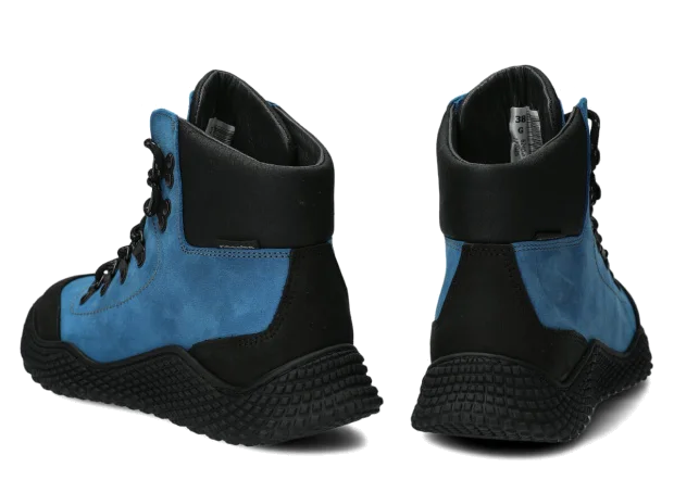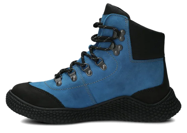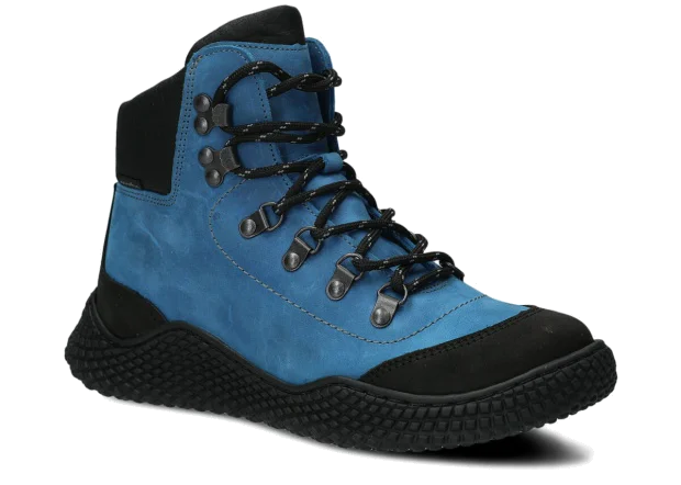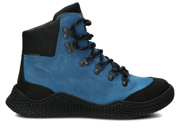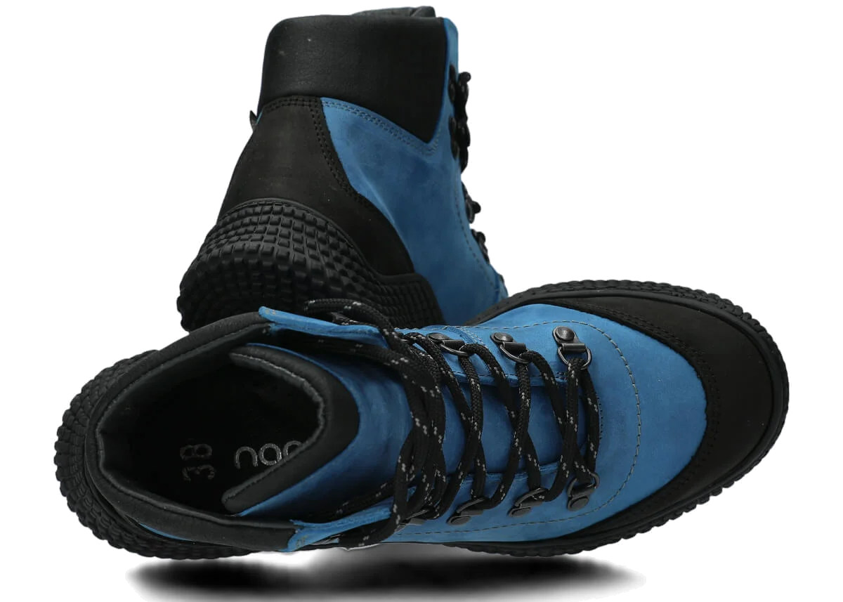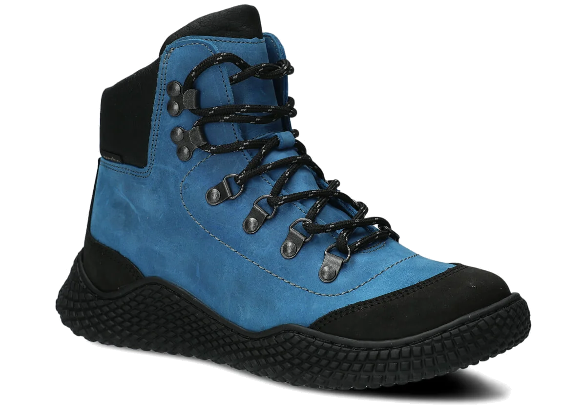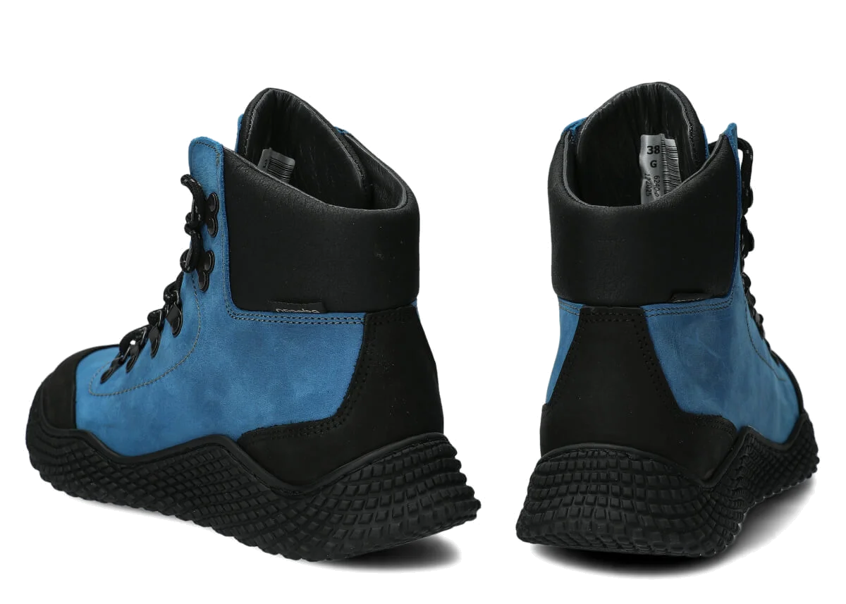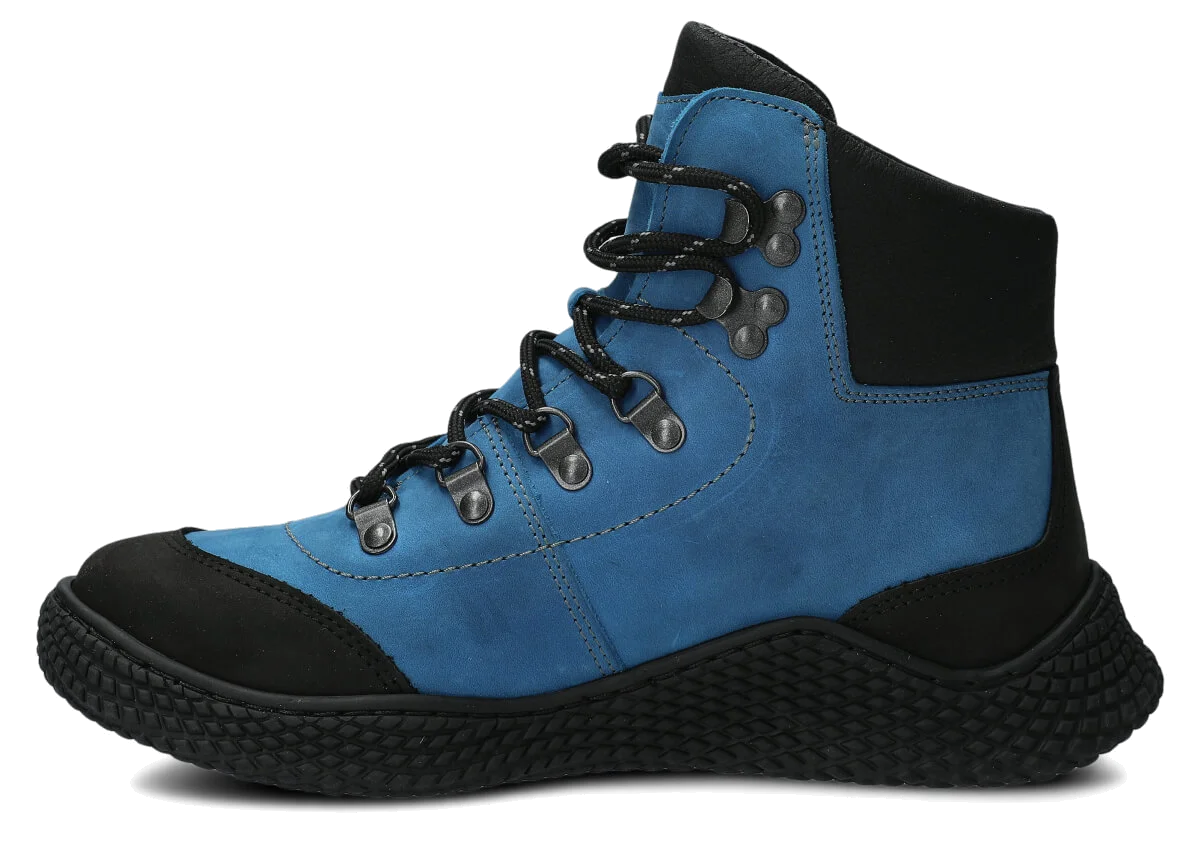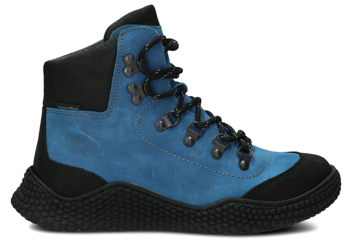 Dámske trekové topánky Nagaba 624 kobalt crazy sú modelom, ktorý presne zodpovedá vkusu žien a tínedžeriek – kombinujú športovú energiu s každodennou eleganciou. Vysoký zvršok nad členkom, kontrastná kombinácia kobaltovej a čiernej crazy kože a ručná výroba v Poľsku robia tieto mladistvé topánky moderné a súčasne mimoriadne odolné a pohodlné.