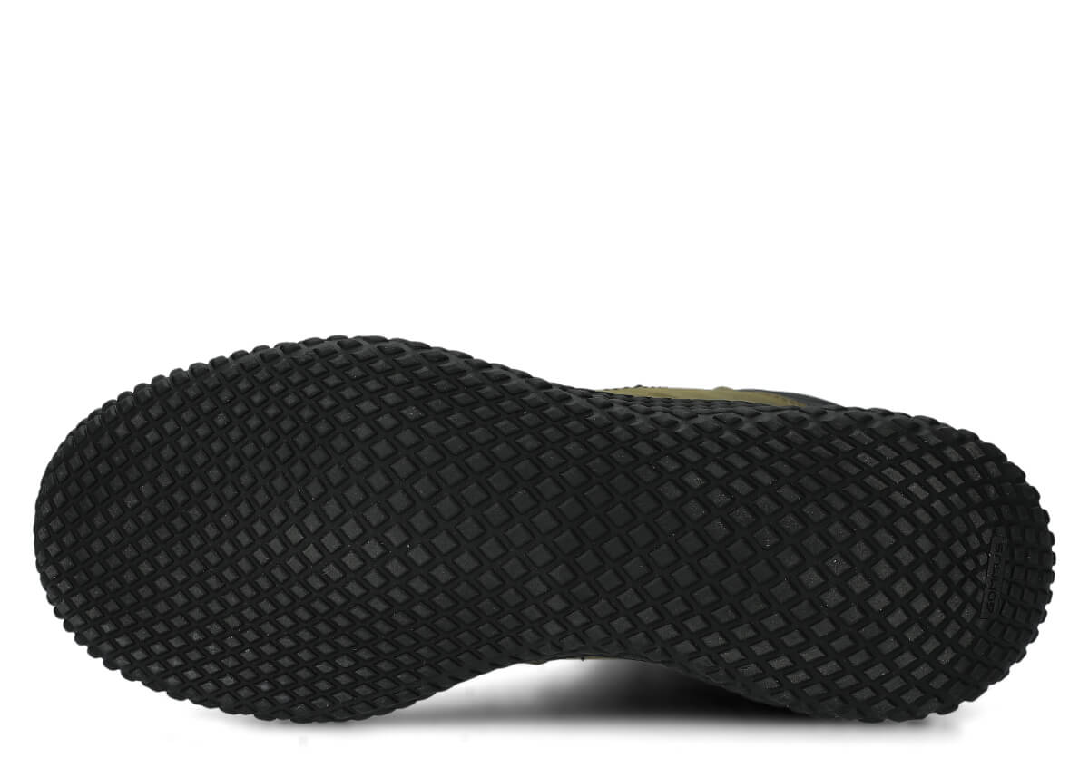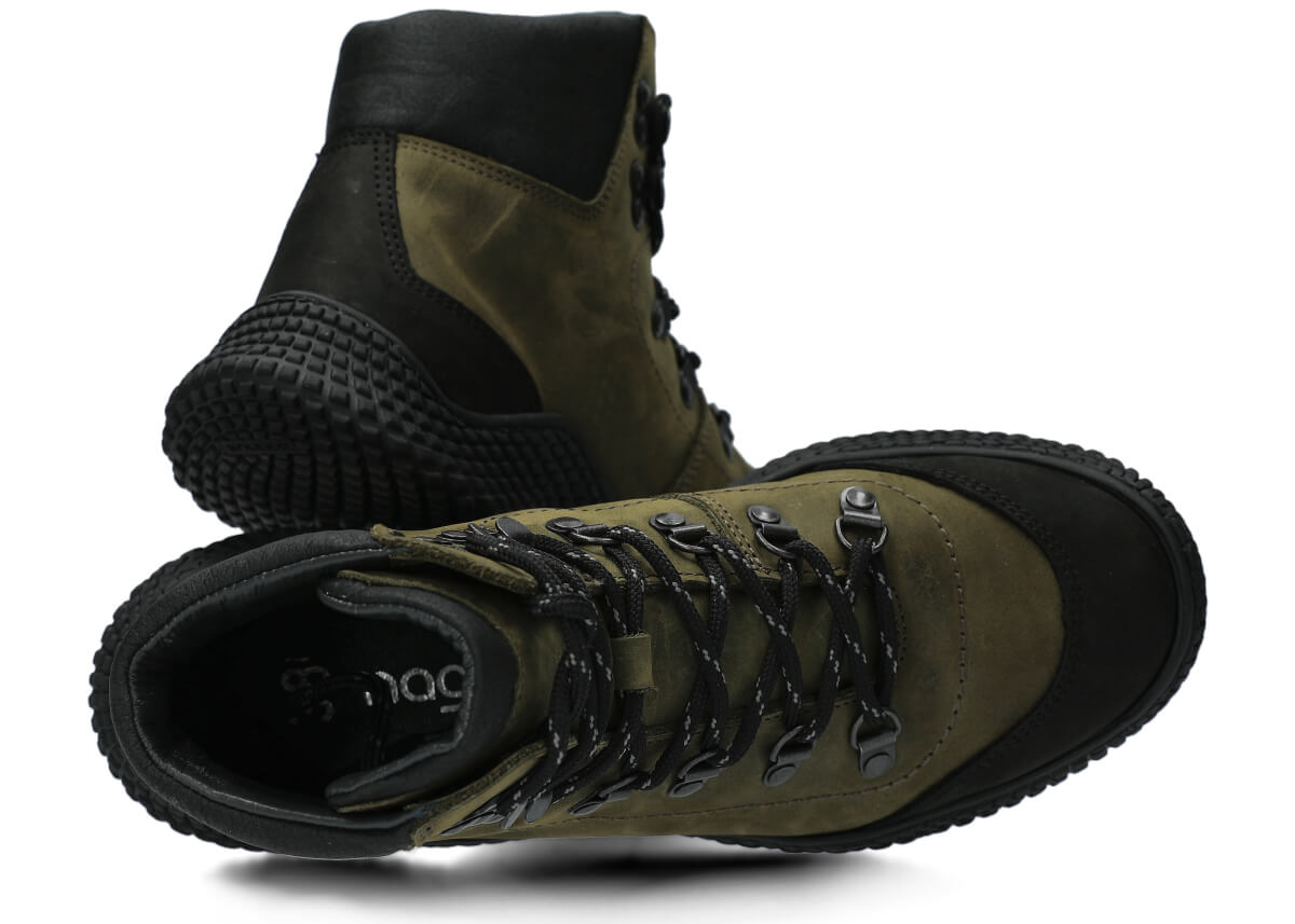 Zvršok pozostáva z kombinácie dvoch druhov crazy kože, pričom dominantná olivová zelená prírodná crazy koža v kombinácii s čiernymi vsadkami na špičke, päte a golieri vytvára veľmi charakteristický mestský outdoorový vzhľad. Hrubá, masívna, olejovaná koža s prírodnými škvrnami, oderkami a škrabancami – každý pár je trochu iný, čo poskytuje pocit jedinečnosti.