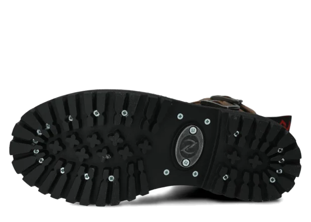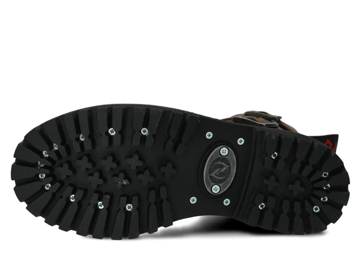 Protišmyková podrážka z pravej gumy je zdobená dekoratívnymi skrutkami a charakteristickým kovovým logom, čo dodáva topánkam jedinečný charakter.
