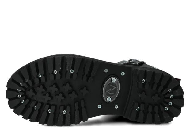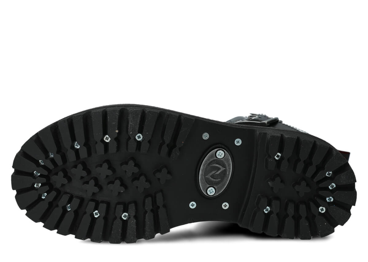 Protišmyková podrážka z pravej gumy je zdobená dekoratívnymi skrutkami a charakteristickým kovovým logom, čo dodáva topánkam jedinečný charakter.