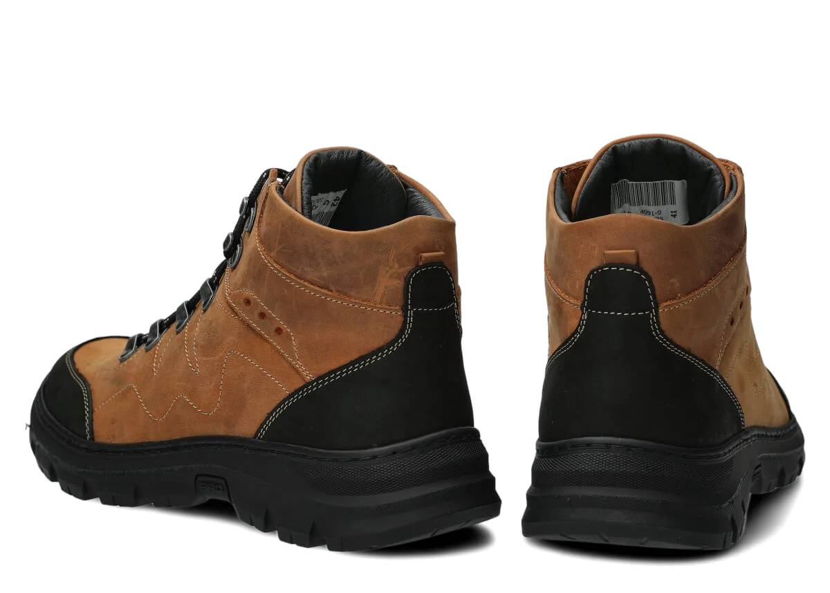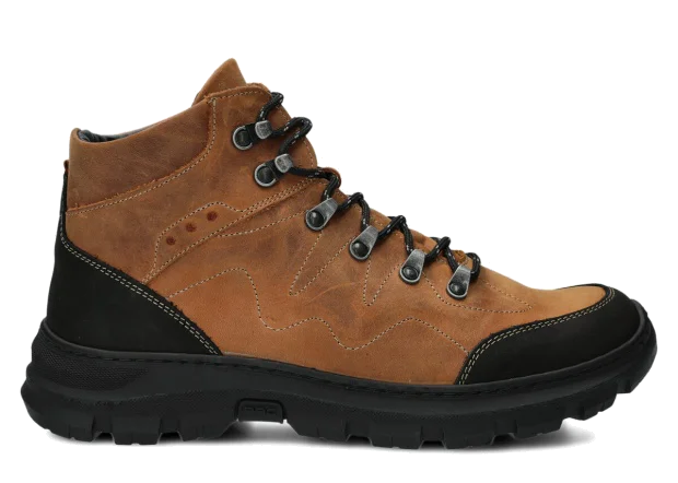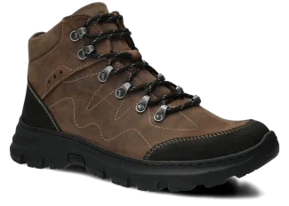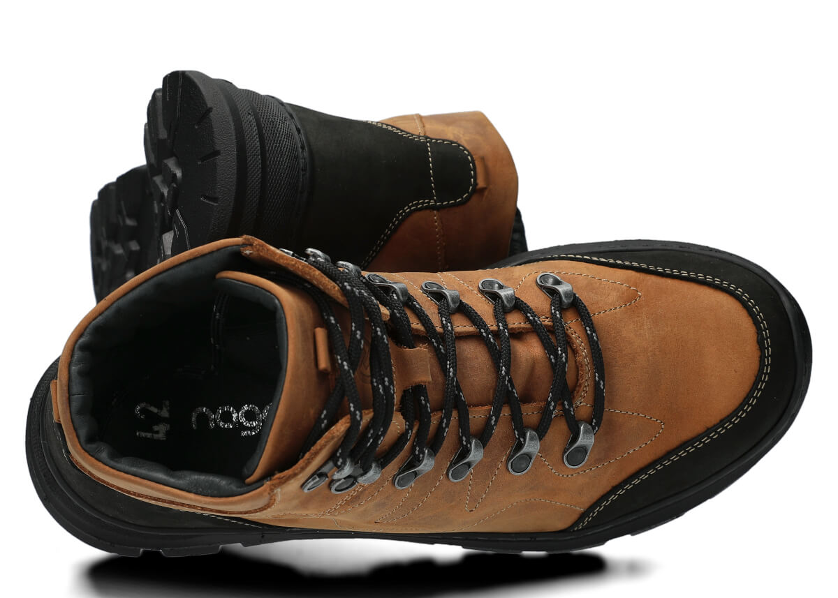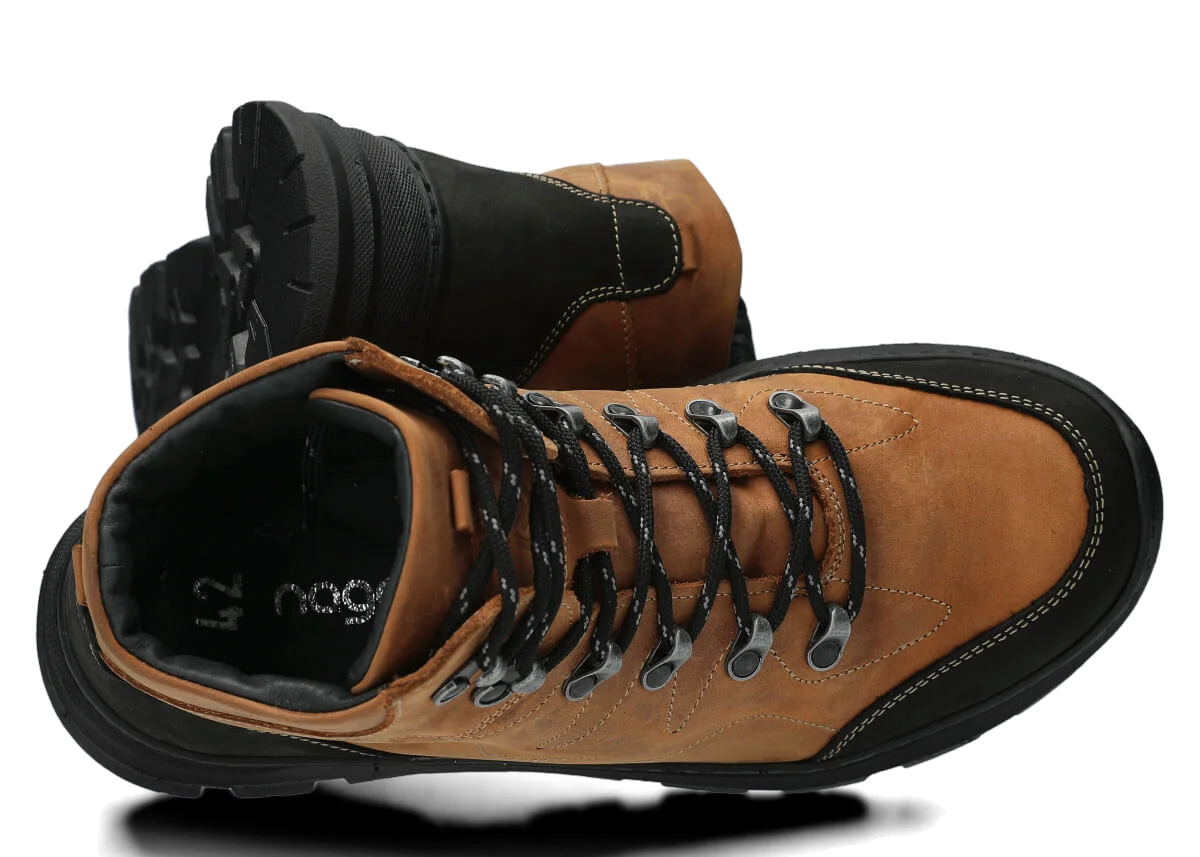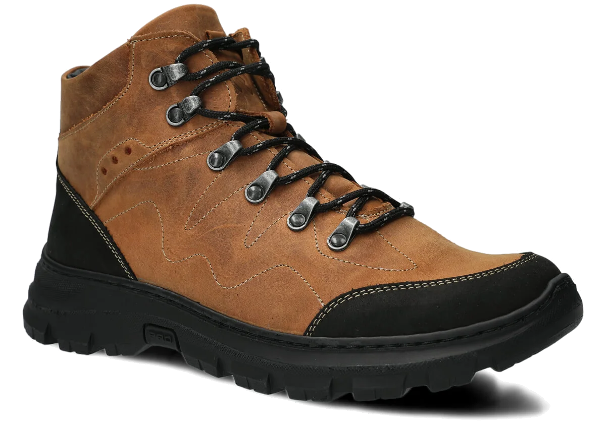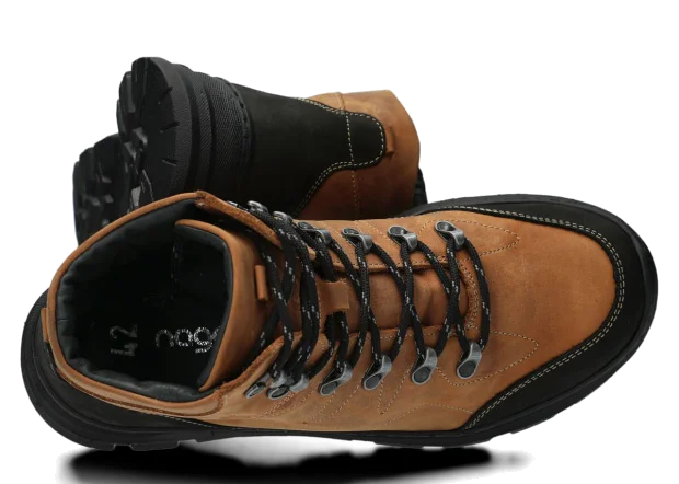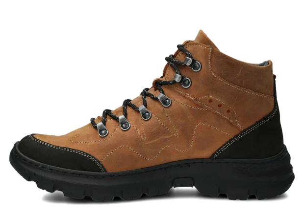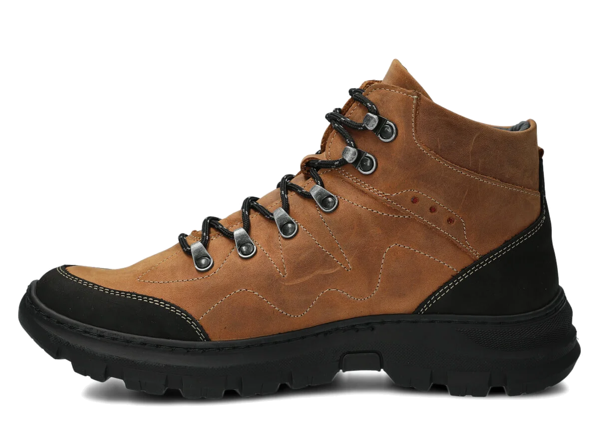 Pánske kožené trekové topánky Nagaba 4091 hnedá crazy sú majstrovským dielom remeselnej práce – ručne vyrobené v Poľsku z odolnej prírodnej kože typu crazy. Topánky nad členok s voliteľným zateplením (filc alebo koža) a protišmykovou podrážkou TR-termokaučuk – ideálne na jeseň, zimu a jar. Dominantná hnedá farba s čiernymi akcentmi na špičke a päte, čierne šnúrky a čierna podrážka vytvárajú moderný, outdoorový vzhľad.